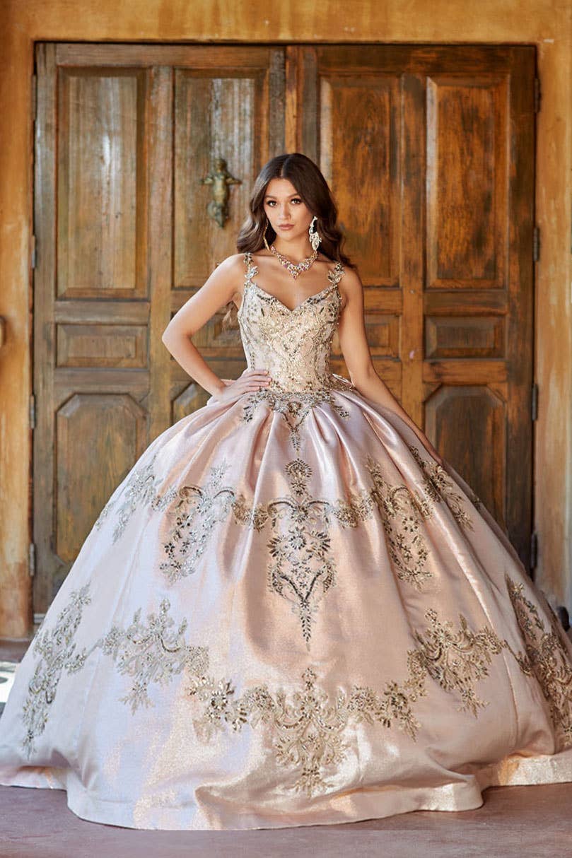 Look truly enchanting in this Rose gold V-Neck Quinceanera Dresses. With gorgeous gold embroidery, sparkly dress.Comes with a big bow and a detachable cape. This Quince Dress will make sure you sparkle on your special day. Make a grand entrance with the perfect dress! -elegant -quinceanera -gold embroidery -Sequins -sparkly - Ball Gowns - Quince Dresses 2023 - Quince Dresses 2024 - Quinceanera Dress 2023 Trend -straps -Cape color may vary due to lighting