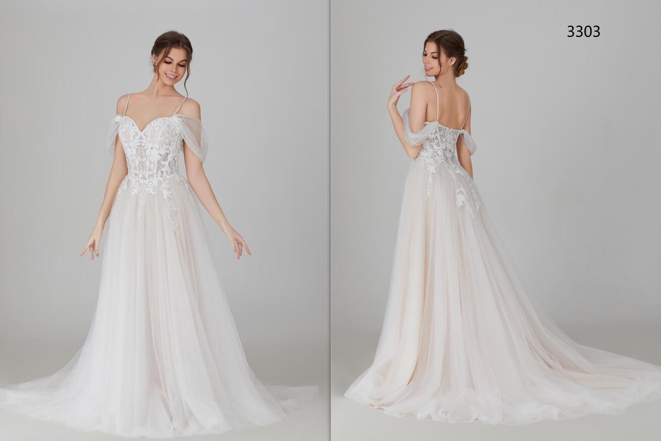 Hannah's Romantic Off Shoulder A Line Ivory/Nude 3303 captivates with whimsical floral appliqués and shimmering sequin details. Its detached sleeves add a touch of romance, while the flattering A-line silhouette ensures comfort and elegance. Perfect for brides seeking a dreamy, sophisticated look on their special day.
