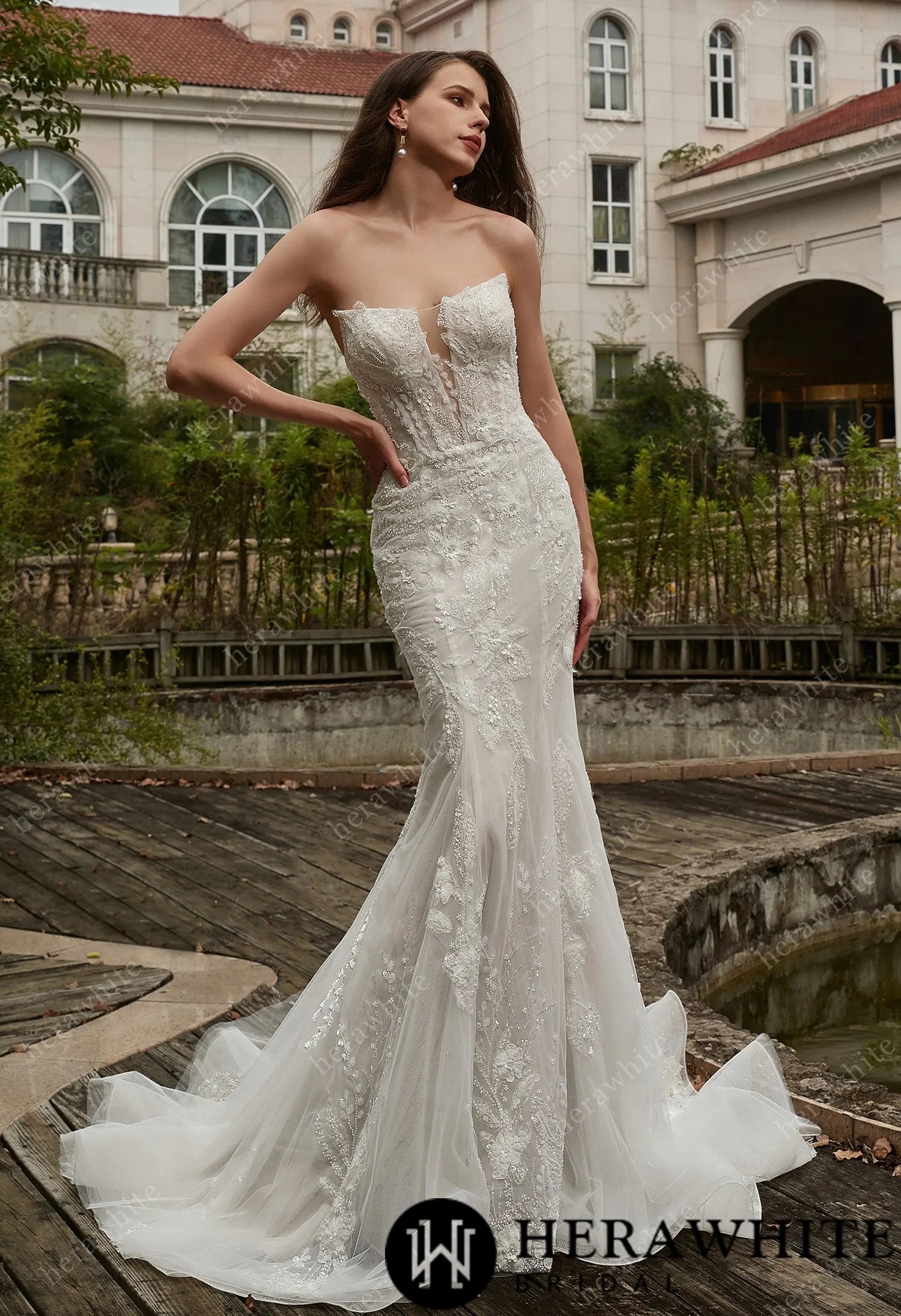 Herawhite- HW3429 Beaded Sequins Lace And Detachable Overskirt Wedding Dress