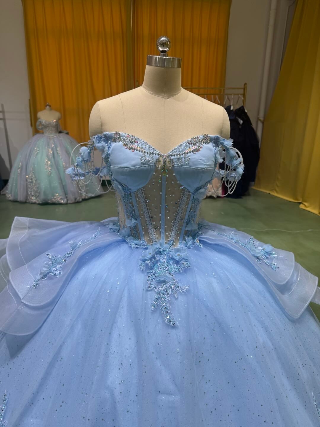 Elevate your quinceañera with the Jocelynne XV Collection-Aponi, featuring a stunning see-through corset bodice that beautifully contours your silhouette. Delicate 3D applique and intricate beading adorn the off-shoulder sleeves, adding a touch of elegance and sparkle. This dress is designed to make your quince dreams come true with its perfect blend of sophistication and youthful charm.
