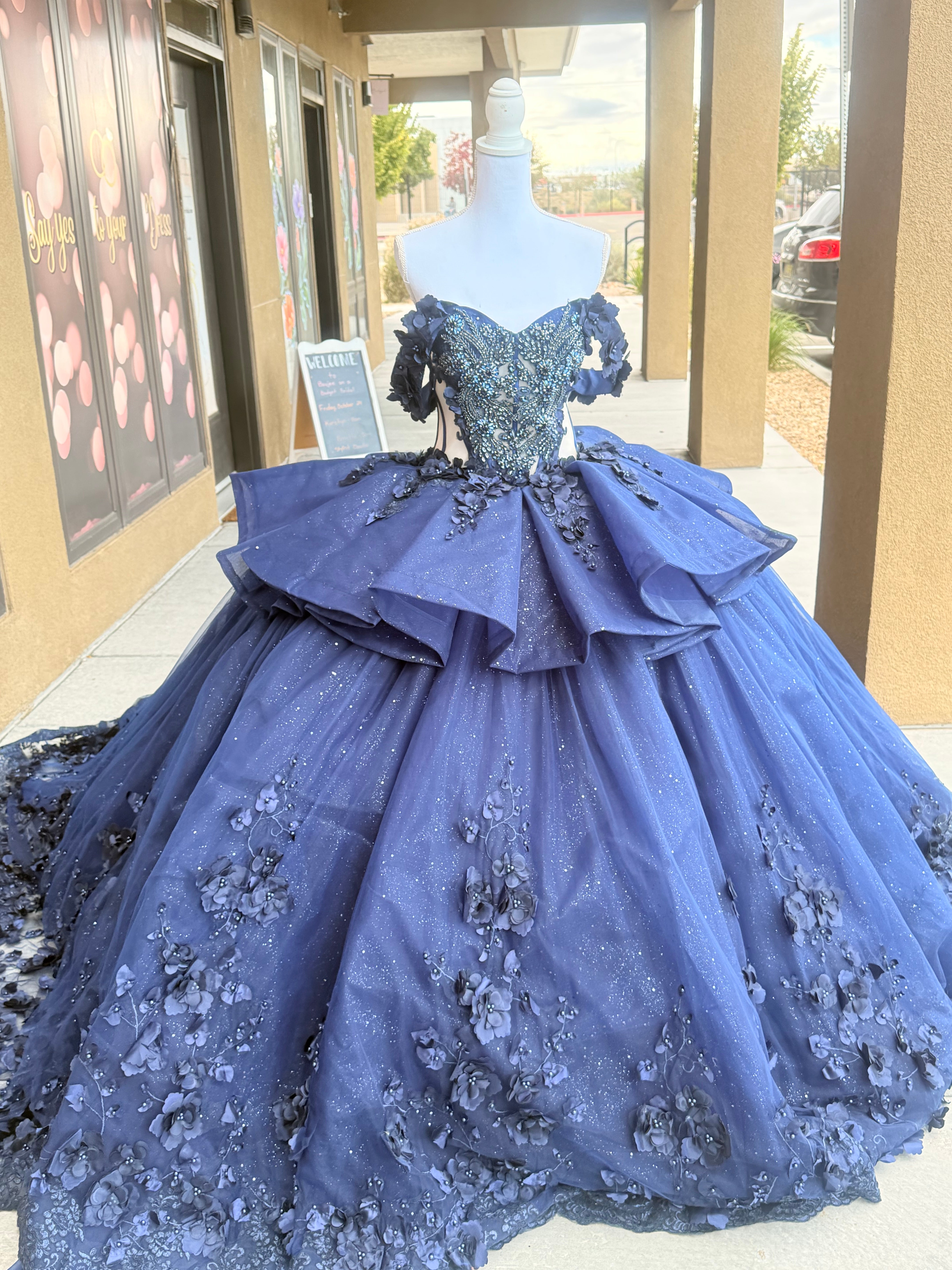 The Joselynne XV Collection - Oralia features a stunning navy blue illusion bodice adorned with a beaded neckline that catches the light beautifully. This super sparkly detail adds a touch of glamour and elegance, making it perfect for any special occasion where you want to shine. Elevate your look effortlessly with this graceful, eye-catching design. Includes Crinoline and Corona