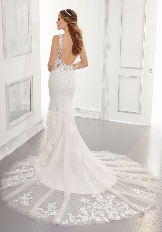 Experience the beauty and elegance of the Mori Lee 5863 Alessia fit and flare wedding gown, expertly crafted in embroidered tulle. The deep V-neckline and illusion sides add a touch of intrigue, while the sheer chapel train exudes undeniable romance. For a touch of glamour, the open back is accented with a removable chandelier beadwork. This stunning dress is available in a size 12 and color Ivory as an off the rack sample.