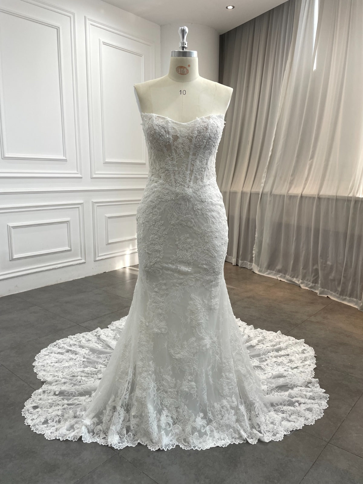 The Starr Bridal – Eliana features a stunning cateye neckline framed by intricate beaded and corded lace, blending modern sophistication with timeless elegance. Its unique fit-and-flare meets sheath silhouette flatters every curve, making it perfect for brides seeking a contemporary yet graceful look on their special day.