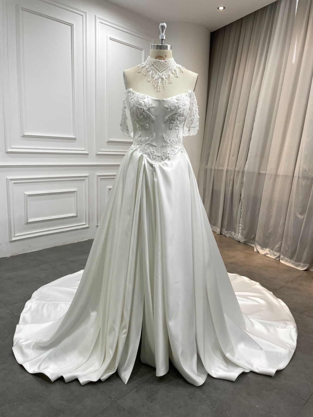 Embrace modern elegance with the Starr Bridal-Graciela gown, featuring a flattering satin fabric and a sophisticated basque waistline that enhances your silhouette. The bodice is adorned with sparkling applique, adding just the right amount of shimmer. A daring slit offers movement and allure, while the matching choker completes this unforgettable bridal look with refined style. Perfect for the bride who wants timeless charm with a contemporary edge.