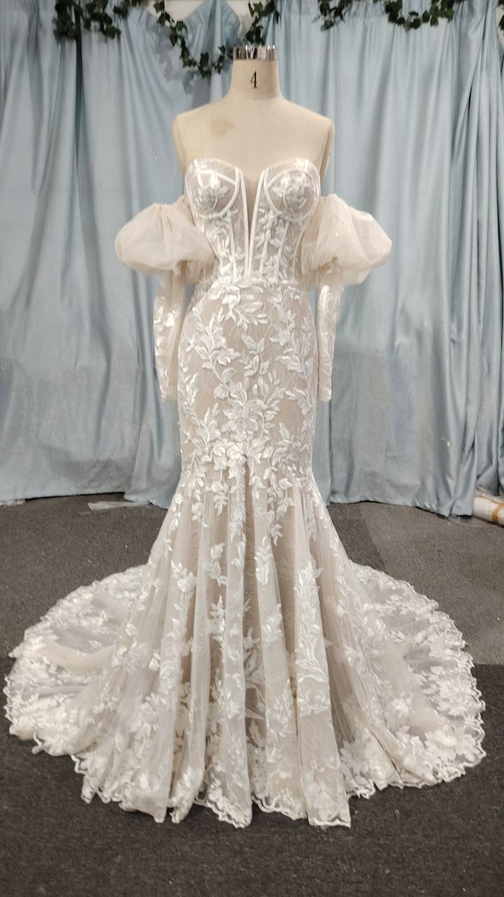 This fit-and-flare gown features romantic floral lace appliques accented with subtle sparkle, creating an enchanting look. The strapless design highlights your neckline, while detachable sleeves offer versatile styling options. A structured bodice ensures a flattering silhouette, making this dress perfect for your unforgettable bridal moment.
