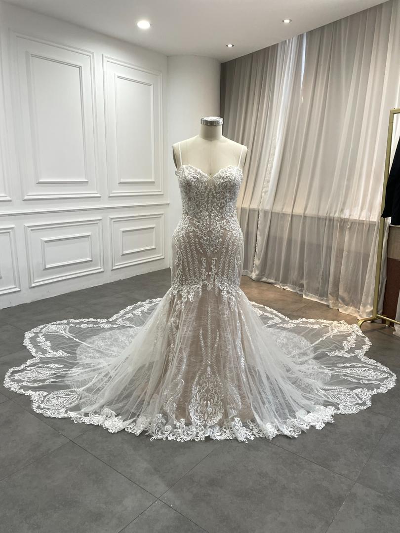 Embrace timeless elegance in our Hazel fit and flare gown. The silhouette accentuates your curves while the vintage-inspired details create an unforgettable look. The showstopping scalloped train adds dramatic flair as you glide down the aisle. Perfect for the bride who desires sophistication with a touch of old-world glamour.