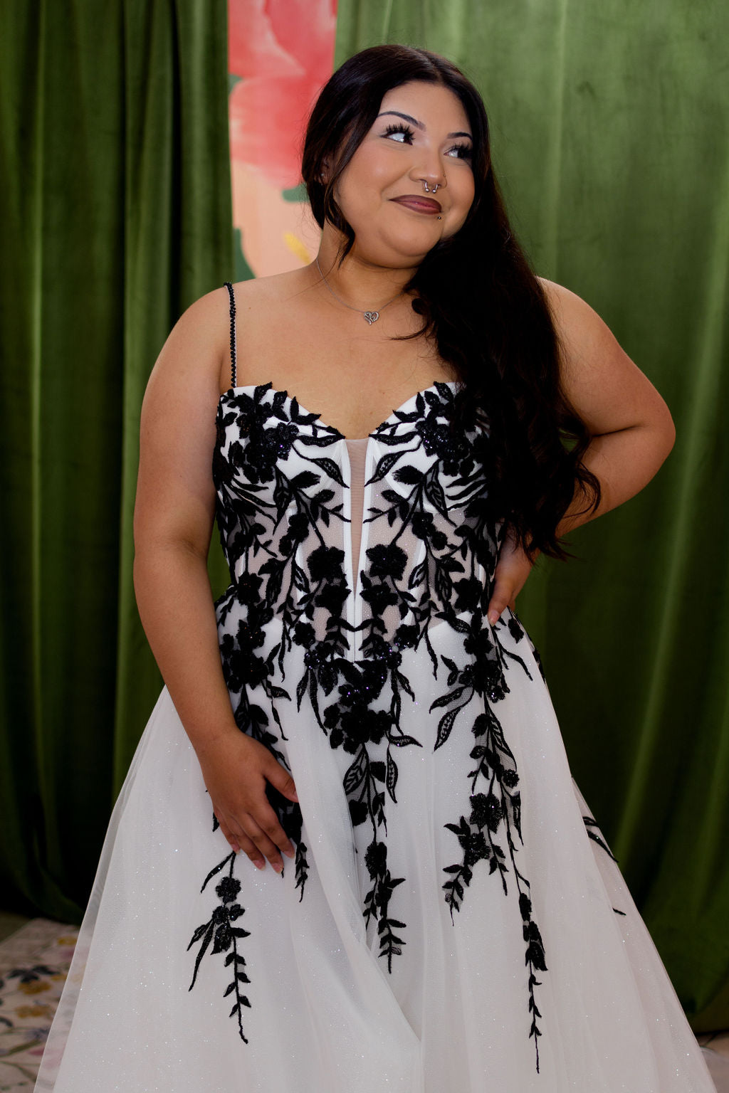 Beautiful a line with visible boning. Ivory and black applique , sparkle tulle underlay for an elevated look. Detachable spaghetti straps . Contact us for customization and assistance with preorder.