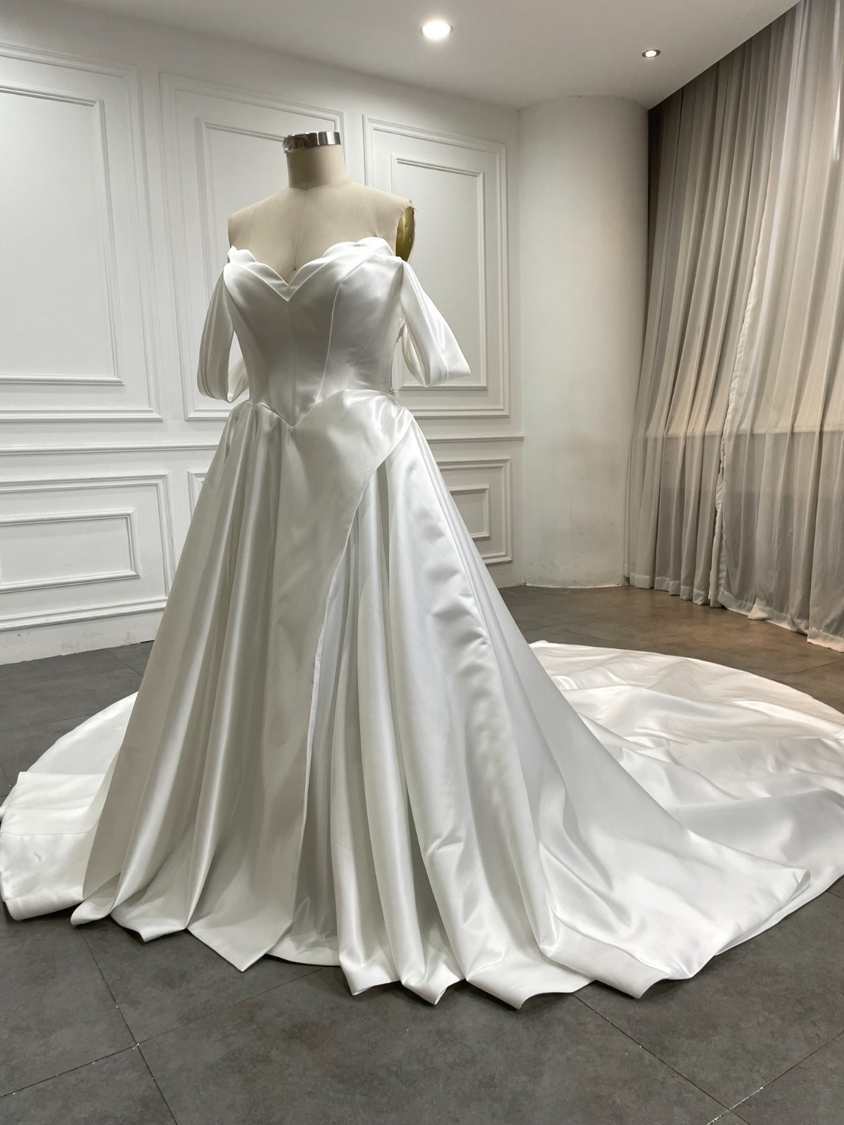 Elevate your bridal look with the Starr Bridal-Jacquelyne gown, featuring a satin scalloped neckline that frames your décolletage with elegance. The high leg slit adds a touch of allure, while the exposed structured back adorned with delicate hand beading creates a romantic and timeless statement. Perfect for the bride seeking sophistication and charm on her special day.