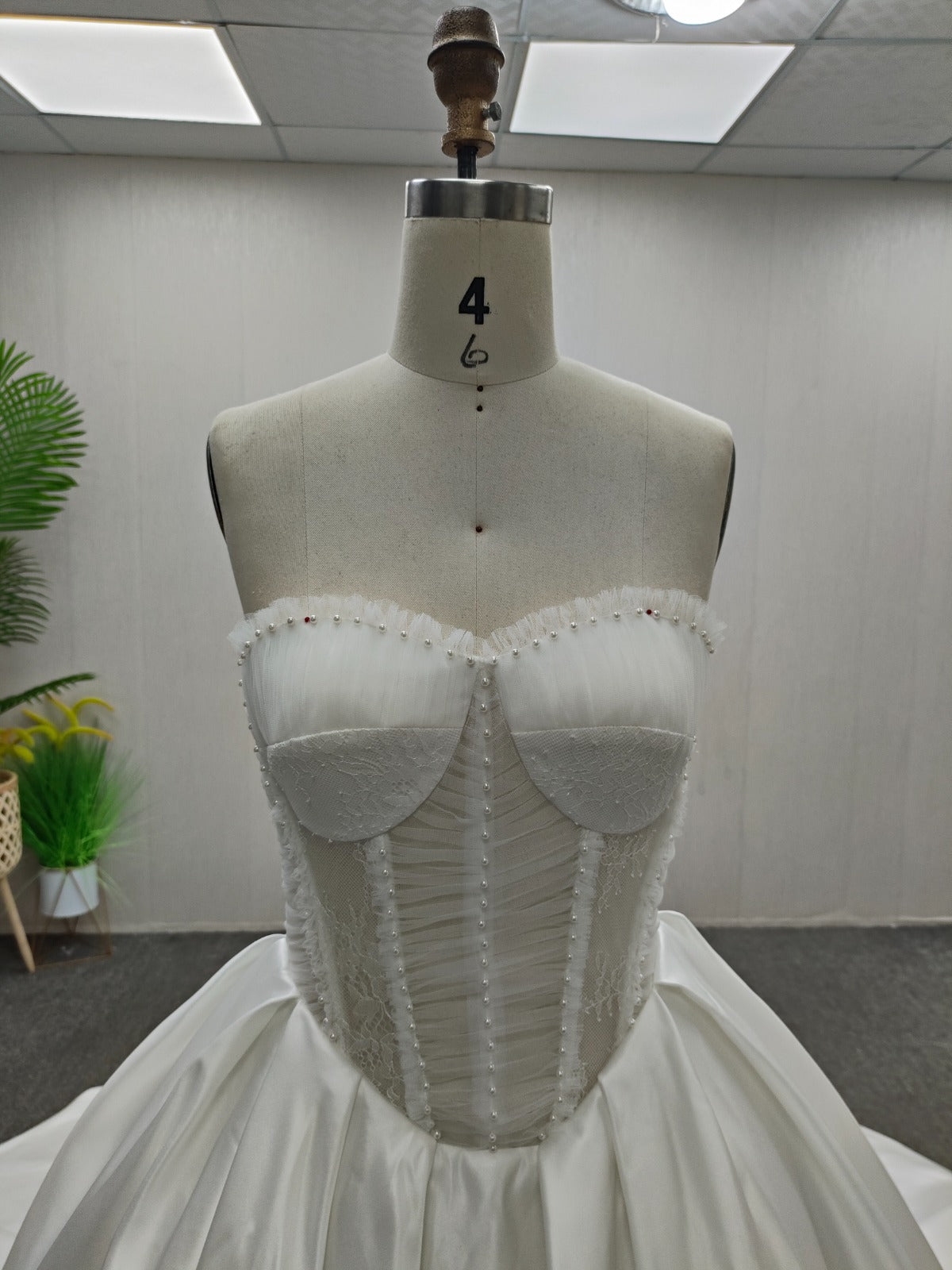Basque waist Ball gown , satin skirt with buttons , tulle bodice with hand beaded pearl edging makes this unique dress a gem of a wedding dress 👰